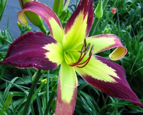 Tetraploid daylily (Stamile 2002). Bloom diameter 10 inch (25 cm). Scape height 30 inch (76 cm). Early mid bloom season with rebloom. Evergreen winter foliage. Crispate Unusual Form.