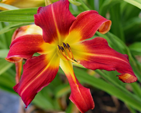 Chris looks bewildered every time I use this American term meaning 'awry.' This lovely plant is neither. A big tall beautiful tomato red Cascade Form. American Daylily Society Junior Citation Award. This big one will command your attention.