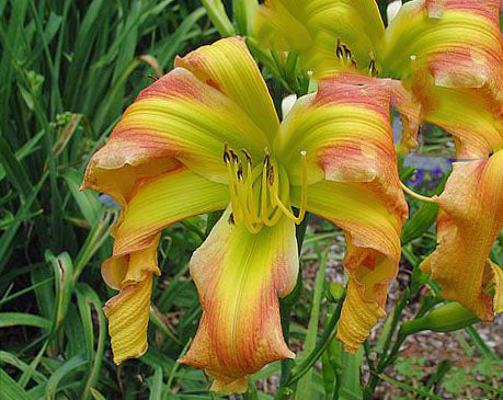 Orange and tan with red eye, huge green throat and cream edge. Crispate Form with great curling.