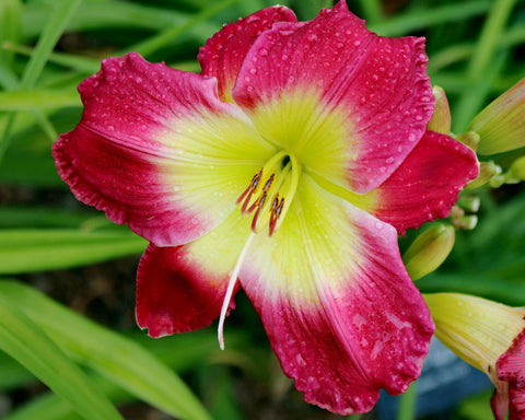 Wide open cerise daylily with a white halo and a huge green throat. Striking.