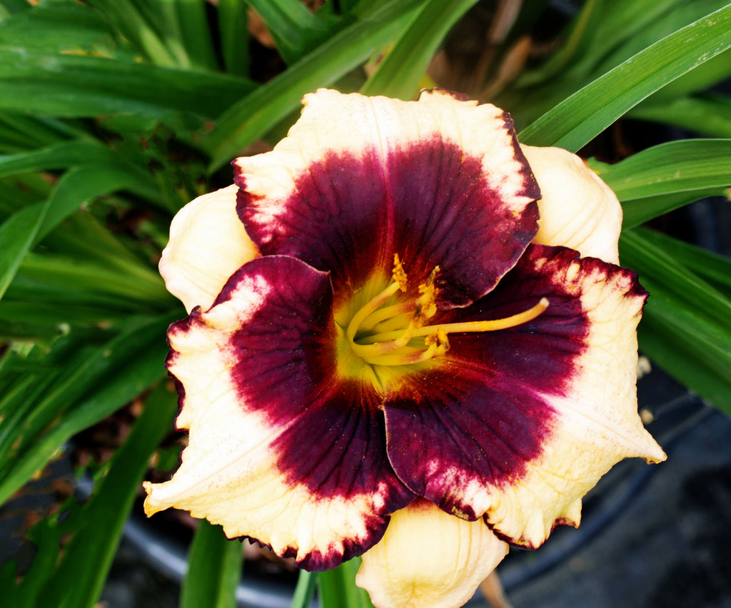 Gorgeous round bloom of cream with a mahogany eye and edge above a green throat.