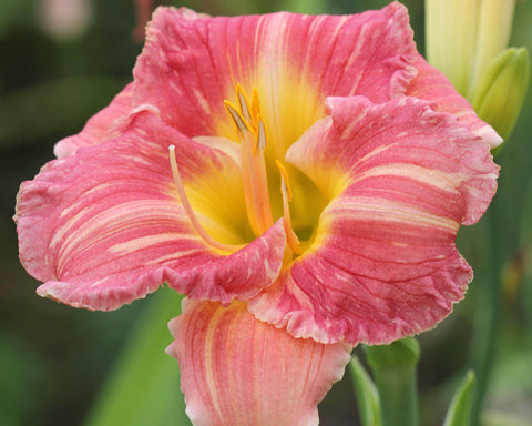 Pink and rose bitone with creamy white striping above yellow to green throat.