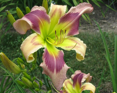 Cascading pink lavender bitone with a fuchsia eye above a green throat. American Hemerocallis Society