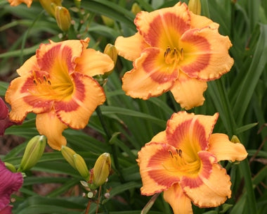 A vibrant orange daylily with red eyezone and edge above a green throat. Awards: AM 2005; HM 2002