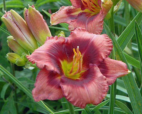Pink hemerocallis with a darker pink eye and green throat. Slight ruffling. Beautiful colouring and a standout in the garden. American Daylily Society Honorable Mention Award. RHS Award of Merit.