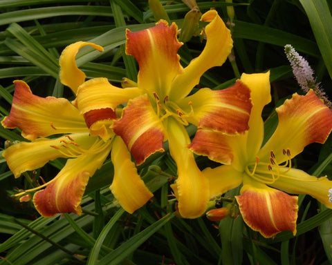 Chinese red and gold bicolour. Good branching and bud count. Gold wire edge may become shark's teeth as plant establishes. AHS Honorable Mention Award.