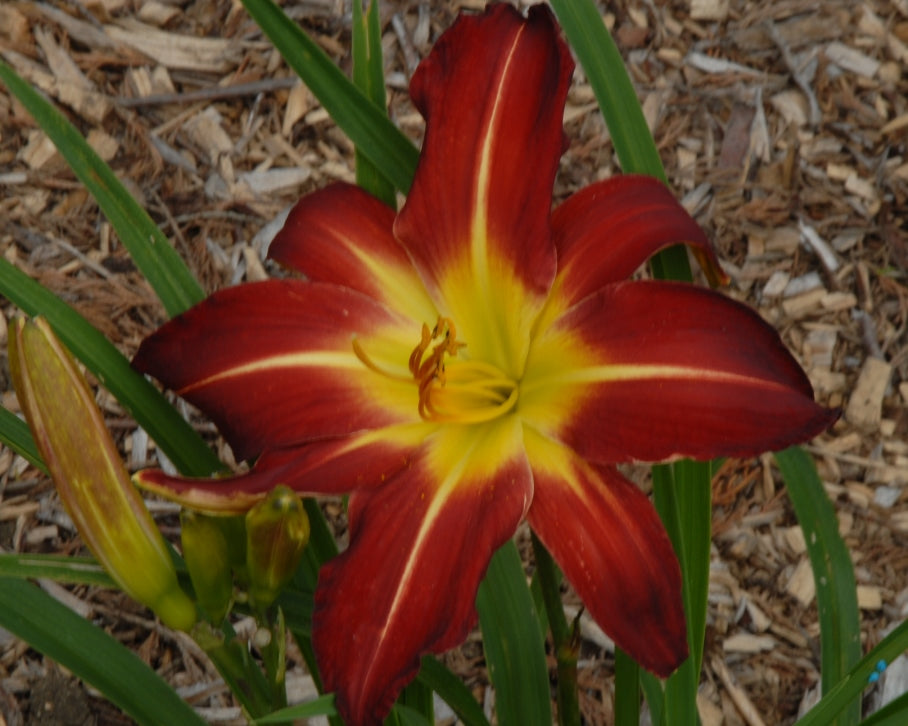Red unusual form with a really wide yellow throat. Fragrant too.