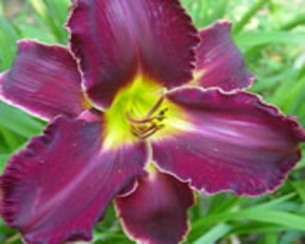 Reblooming purple daylily. Lilac halo with white edge and midribs above a green throat. Very outstanding. In warmer weather it will display a partial toothy edge. AHS Honorable Mention Award 2005.