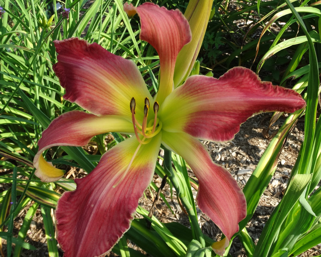 "Tetraploid daylily (Davisson J 2008). Scape height 32 inches (81 cm). Bloom diameter 9.5 inches (24 cm). Mid season bloom. Semi-evergreen winter foliage."