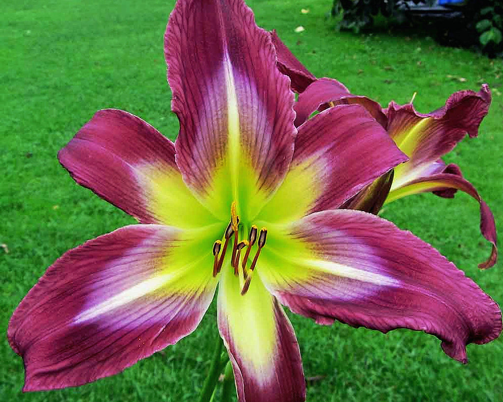 Maroon with a huge violet eyezone and a very green throat. Petals are lined in various shades of color. Petals and sepals are edged in the same eye zone color. Sepals eyezone diffuses into cream.