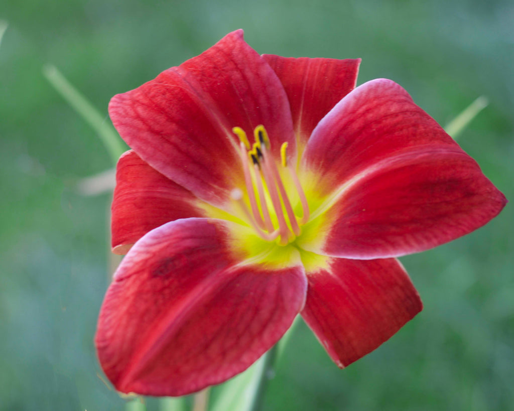 Very dark red bloom with nice contrasting green throat.