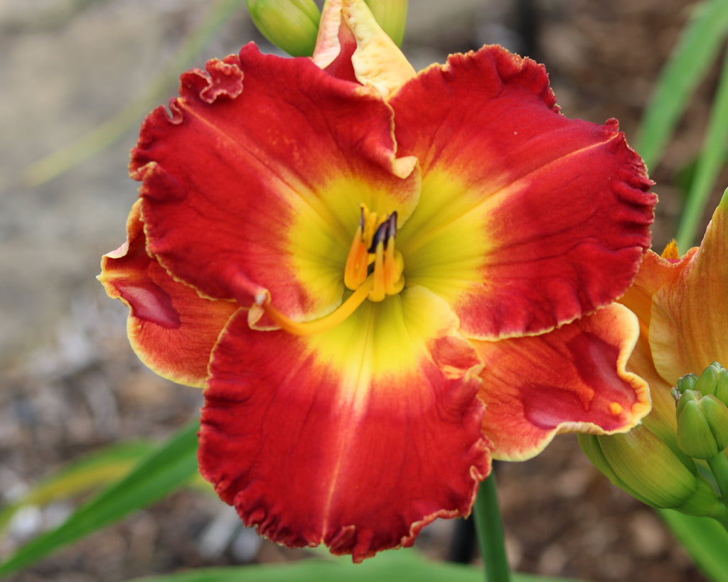 Ruffled red orange with huge watermark above green throat. No one does it better than Dale Hensley!