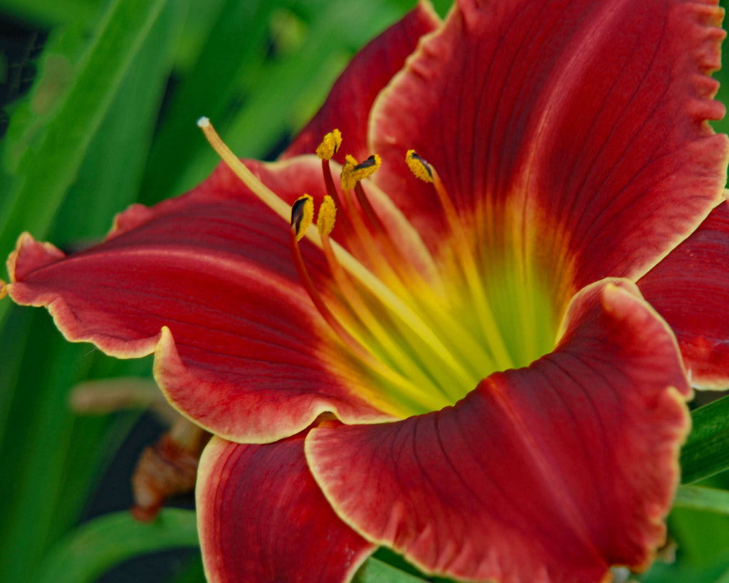A beautiful red daylily with an ivory edge and an emerald green throat. Awards: AM 2006; HM 2003.