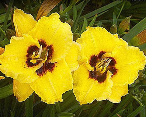 Miniature yellow with dark maroon eye zone. A tiny garden delight.