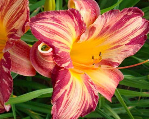 Very popular striped hemerocallis. Red with cream stripes.