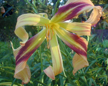 Diploid (Temple 1992). Bloom diameter 8.5 inch (22 cm). Scape height 28 inch (71 cm). Early bloom season with rebloom. Evergreen winter foliage. Spider Ratio 6.00:1.