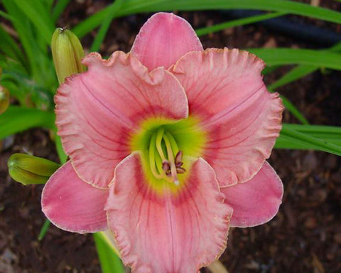 Pretty pink hemerocallis with red eye and edge over green throat. Reblooming and very fragrant. Multiple American Daylily Society awards: Annie T Giles Award for outstanding small bloom, Honorable Mention Award, and Award of Merit.