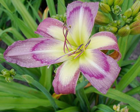 Pink lavender with a chartreuse throat, darker eyeband.