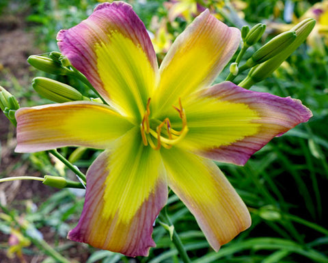 Lavender pink with a huge darker lavender patterned eyezone and a huge green yellow starburst throat.