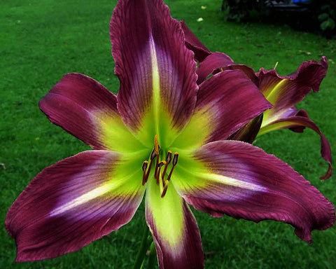 Maroon with a huge violet eyezone, a very green throat, petals are lined in various shades of color, petals and sepals are edged in the same eye zone color sepals eyezone diffuses into cream.