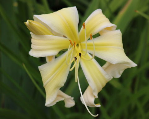 Near white to yellow bloom with a bright green throat. American Daylily Society Honorable Mention.