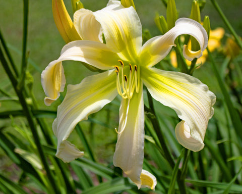 Pale yellow diamond dusted hemerocallis with slight ruffling above extended green throat. Cascading unusual form. Awards: Honorable Mention 2017, Award of Merit 2020. 2022 Stout Silver Medal Winner!