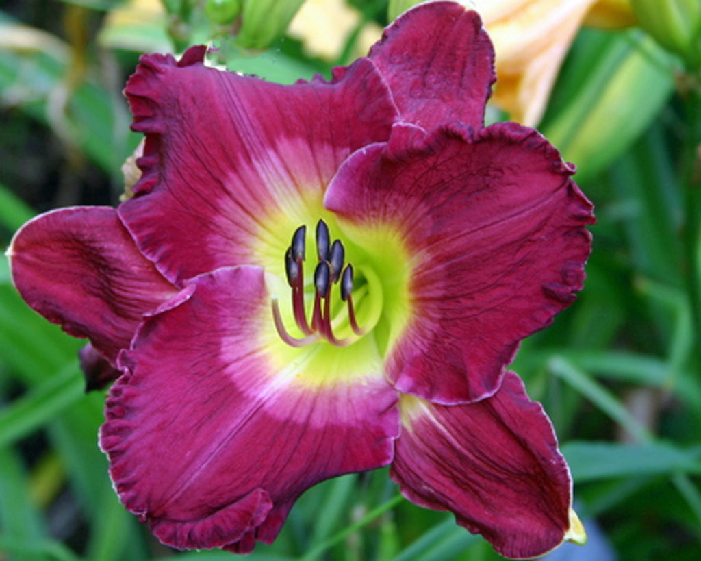 Lovely big hemerocallis bloom of deep violet purple with contrasting chartreuse throat. Great substance and reblooms. AHS Honorable Mention Award.