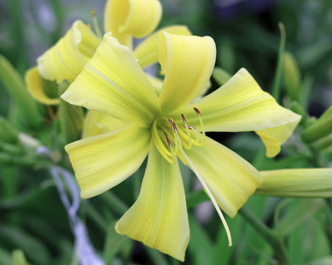 Neon yellow cascading daylily with a glowing green throat. Will sometimes poly (4 petals,4 sepals).
