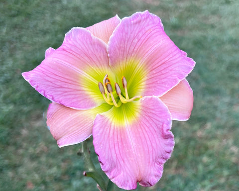 Lilac pink bitone small bloom is just soooo cute. Prominent veining and green to yellow throat. Slight piecdrust cream edging. Great bloom and rebloom too.