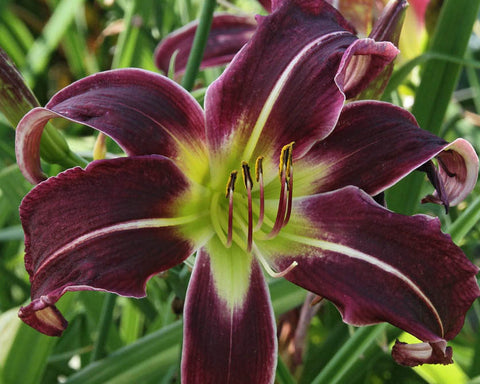 Cascading bloom of dark purple with white midribs above green throat. Gorgeous! Valuable later season bloom.