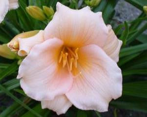 Blush pink to melon hemerocallis with green lemon throat. Extended bloom. Awards: HM 2001; FS 2000.