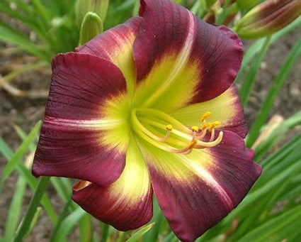 Special black purple hemerocallis with large chartreuse centre. Reblooming. AHS Honorable Mention Award.