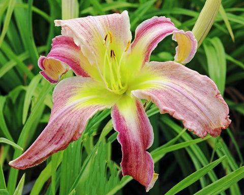 A reverse bi-tone with pink/red sepals and lemon blushed petals with light red stippling. Tall plant and prolific bloomer.