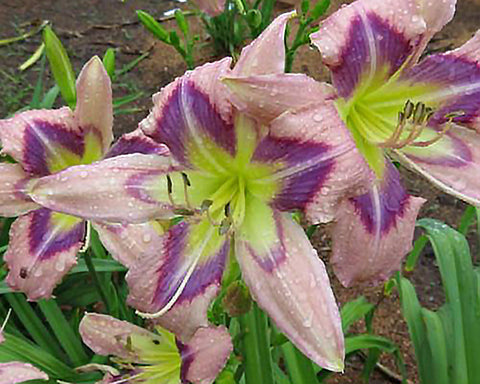 Lavender pink with a lavender bluish purple eyezone and green throat. A GREAT parent!