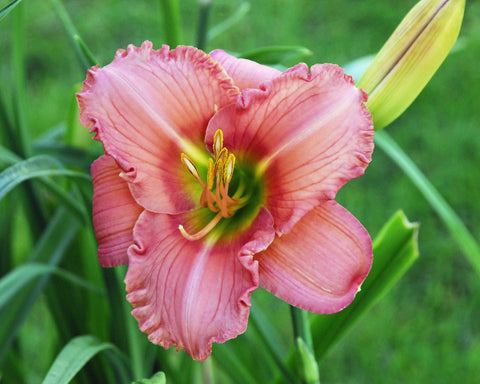 Deep shell pink with hot pink eye above a stunning green throat. Prolific bloomer. Awards: HM 2013.