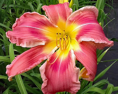 Big coral pink cascading bloom with a darker pink eye and curling petals and sepals. Lovely pale pink edge sets this bloom off. Reblooming and fragrant. Awards: AM 2018; HM 2015; L/W 2018. 2022 Stout Silver Medal Runner-up and 2022 Lenington All-American Award!