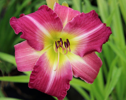 Pink lavender bi-colour with large light pink watermark above green throat.