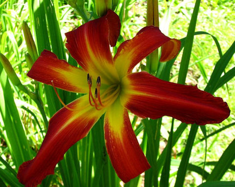 Terrific towering crimson red cascade unusual form with a green throat. AHS Honorable Mention Award 2006.