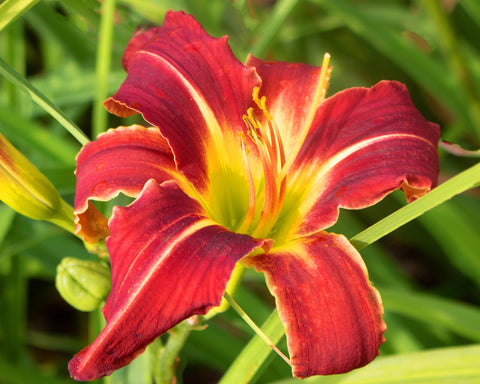 Cranberry red stunner, slightly darker eye with chartreuse midribs and yellow green throat. Lovely cream edge on sepals.