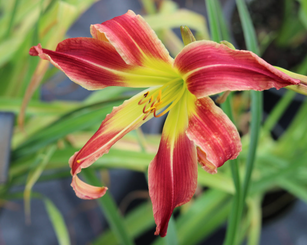 Cherry red with yellow midribs and cream edge above chartreuse throat.