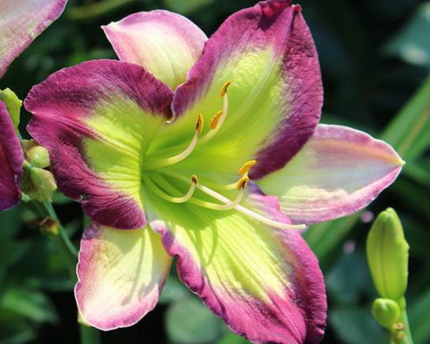 Small bloom daylily of purple with a green throat that extends out onto the petals, lighter purple sepals. Or is a green daylily, edged in purple?