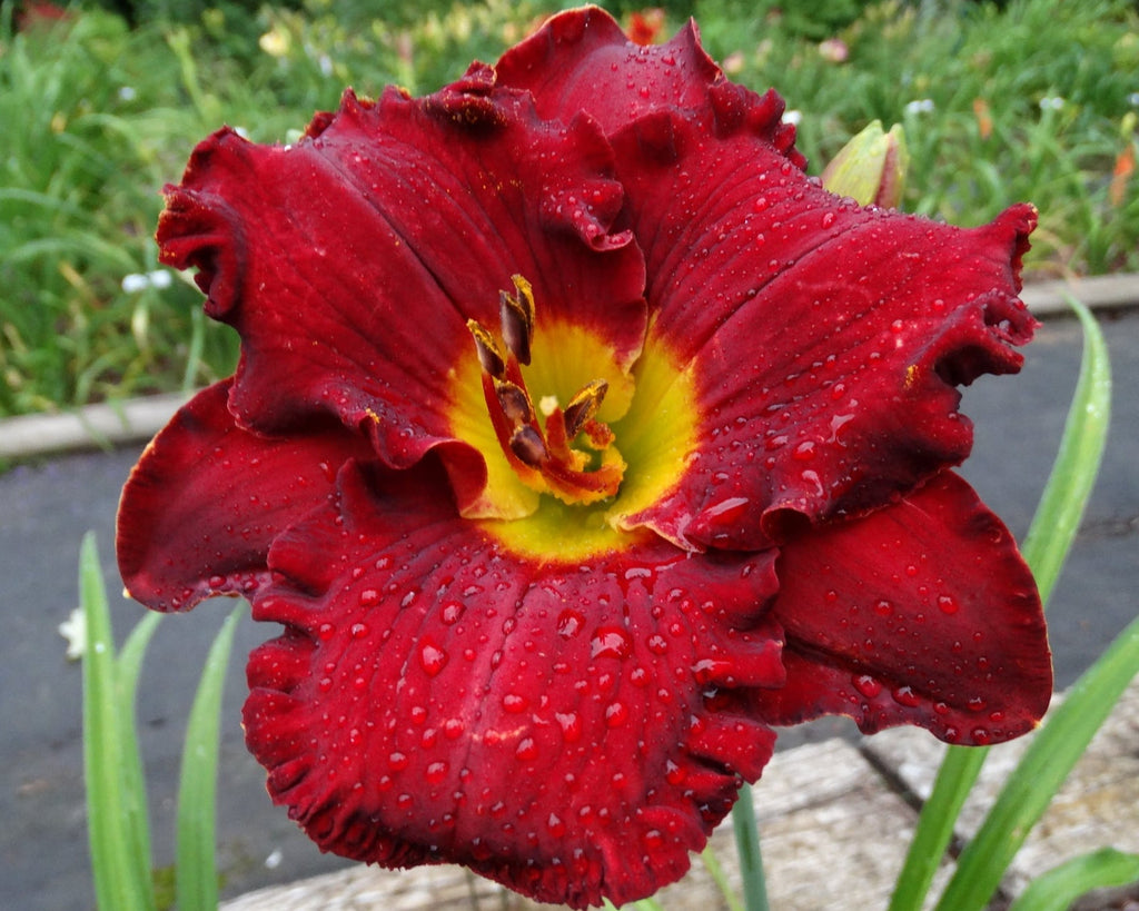 "Tetraploid daylily (Hensley D 2012). Scape height 35 inches (89 cm). Bloom diameter 6 inches (15 cm). Mid late bloom season with rebloom. Dormant winter foliage. Fragrant."