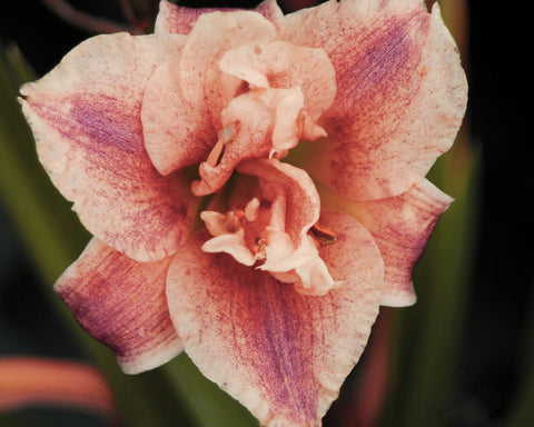 Spotted tan peach peony blend double with lime green throat. Love this little one! Awards: AM 2017; HM 2013.