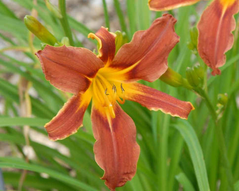 Brown and gold small crispate unusual form with faintly darker brown eye above deep green throat. Fragrant. A great garden performer!