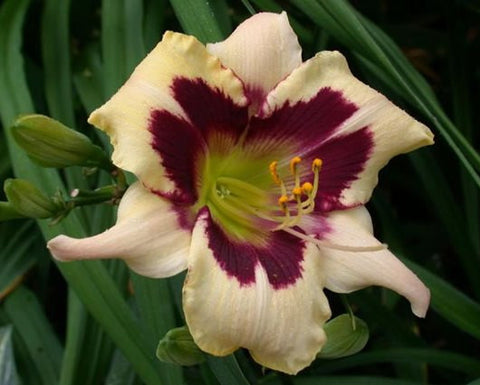 Tetraploid (Salter, 1992). Bloom diameter 5.5 inch (14 cm). Scape height 26 inch (66 cm). Early mid bloom season with rebloom. Semi-evergreen winter foliage.