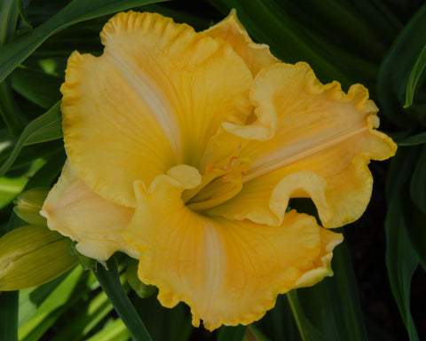 Creamy butter yellow self with gold edge and green throat. Fragrant and reblooming. AHS Honorable Mention Award and Award of Merit.