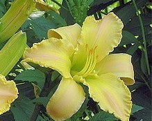 Yellow pink fragrant hemerocallis with green throat.