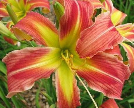 Veined pink spider variant with lighter edges, red eyezone and huge yellow-green throat. AHS Honorable Mention Award 2005.
