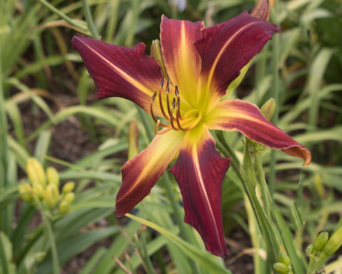Beautiful burgundy with darker red veining above chartreuse star patterned throat. This hemerocallis is a big tall spatulate unusual form. Junior citation award 2008.