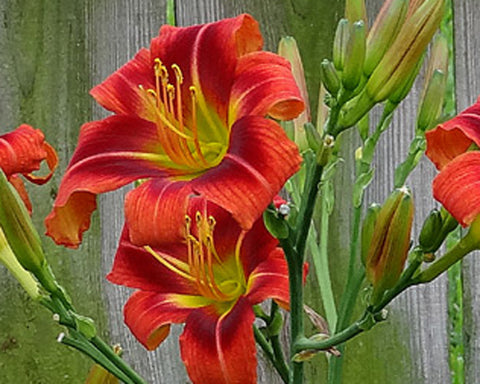 Petals and sepals are fire red with centre eye of crimson. Tight green throat. Abundance of bloom.